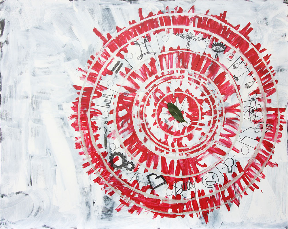 The assemblages offer a different line of enquiry in the exploration of time as a theme in painting. The affixing of material objects to the surface of the canvas adds a distinct layer of materiality that accrues symbolic density and dimension, and unleashes mental energy generously. The recognition of self is brought to the fore in assemblage-paintings in which Fridman incorporates mirrors. The canvas has been suggested to stand as a reflecting plane held up to the artist´s bodily presence with painting embodying narcissistic impulses. The transient nature of reflections in mirrors affixed to the canvas surface is underpinned by the classical myth of Narcissus and brings impermanence into the equation. The individual viewer briefly stands in the artist’s shoes. Viewers, however, may choose to only recognize their fleeting reflections as part of the work’s symbolic net. Thus, they ssee themselves interacting with the asssemblage and through their reflected bodies are briefly integrated to it.