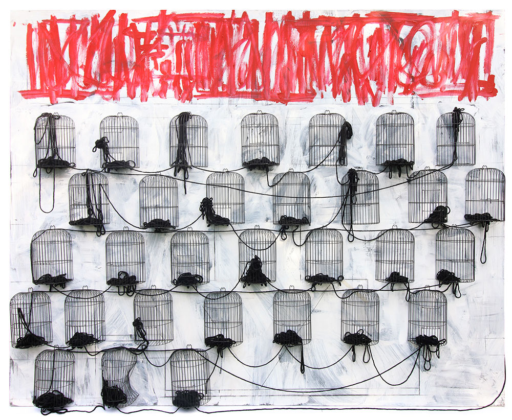 Acrylic on canvas with metal cages and wool, 200cm x 250cm