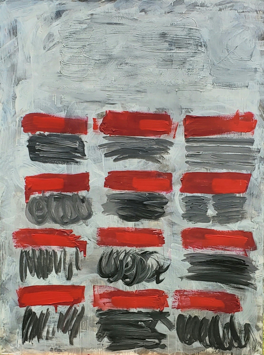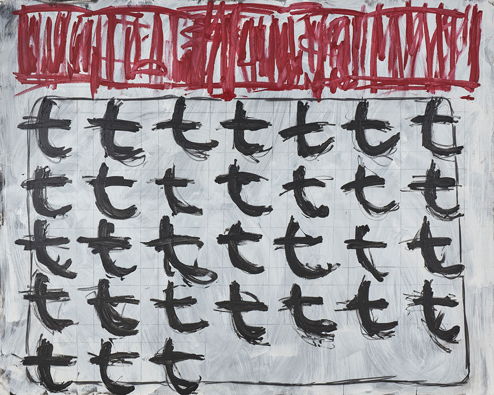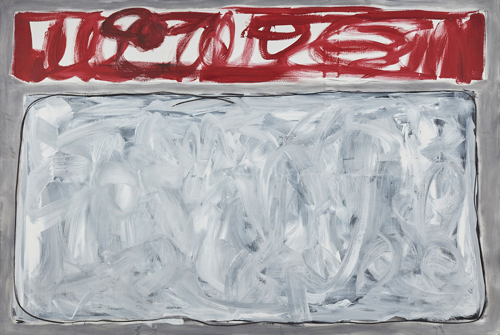 The artist eliminates and/or substracts explicit information that by convention is part of the basic design. There are no names of months or days, in full or in abbreviation in any of the works. The abstract mode imposes itself on the borrowed motif. The color scheme provides an abstract structure throughout, amounting to a red, thin shape, suggesting a rectangular form fleshed out through scribbles, doodles, overwritings and obliterations; and beneath it a rectangular body of expressively handled white paint over a black ground, that extends to the edge of the canvas. It is on this painted field that other signs are added, all of them seem to be abstract. Some are vernacular, commonplace markings; others are scientific symbols or mock-erudite, pseudo-calligraphic notations. The similarity in basic composition of all canvasses suffices for a system to be generated. This underlines the neo-conceptual edge of DAYS as a series. The dismantling of the referent allows the configuration of a possible new visual metaphor. (This does not exclude a possible metonymical reading of the series).